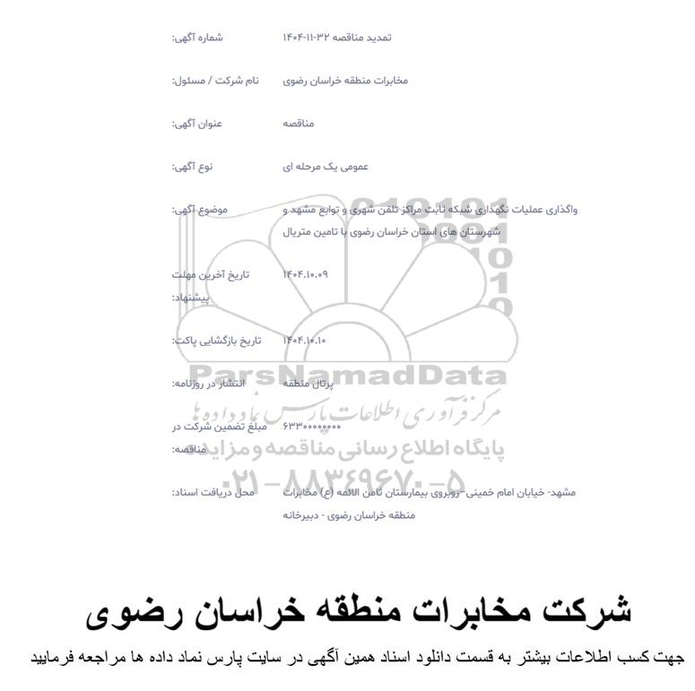 موضوع آگهی: واگذاری عملیات نگهداری شبکه ثابت مراکز تلفن شهری و توابع مشهد و شهرستان های استان خراسان رضوی با تامین متریال