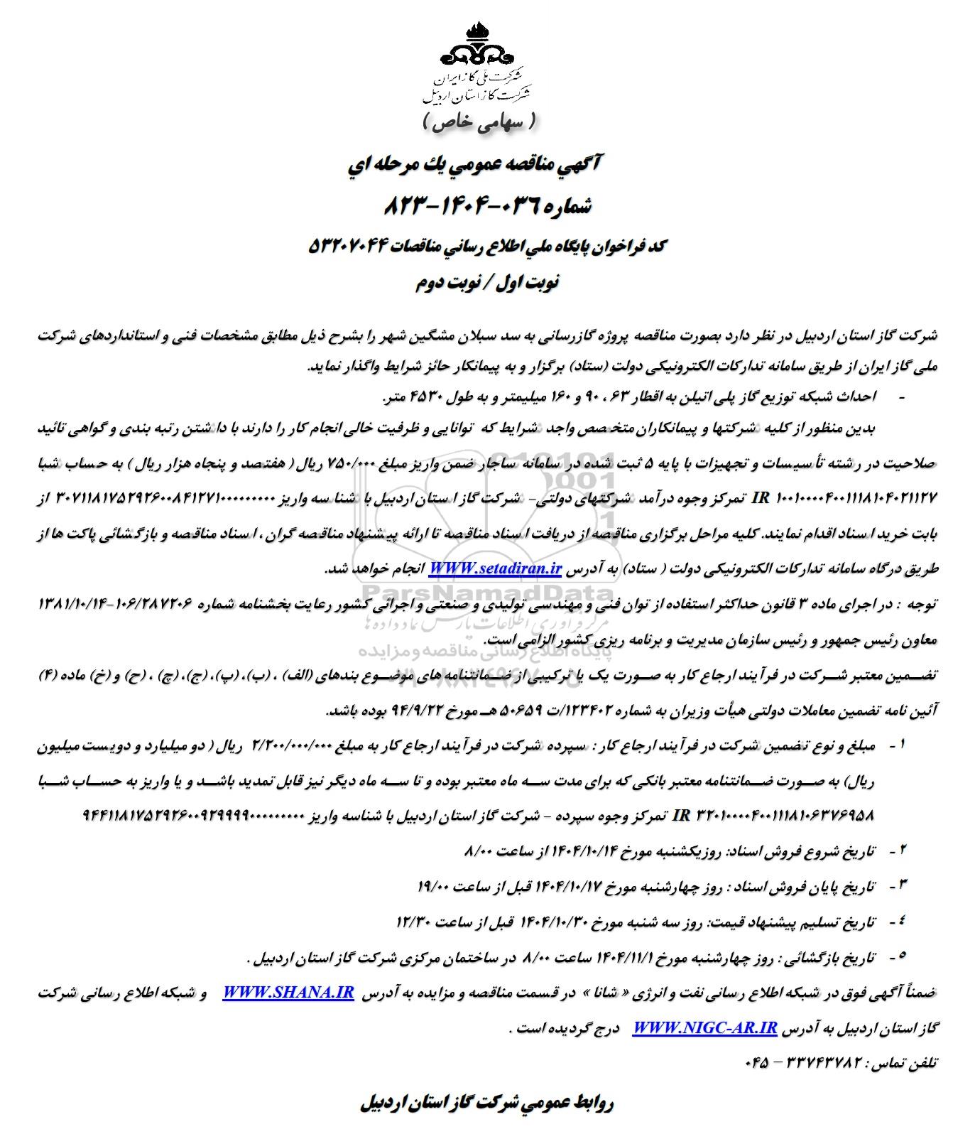 ضمنا آگهی فوق در شبکه اطلاع رسانی نفت و انرژی شانا در قسمت مناقصه و مزایده به آدرس WWW.SHANA.IR و شبکه اطلاع رسانی شرکت گاز استان اردبیل به آدرس WWW.NIGC-AR.IR درج گردیده است.