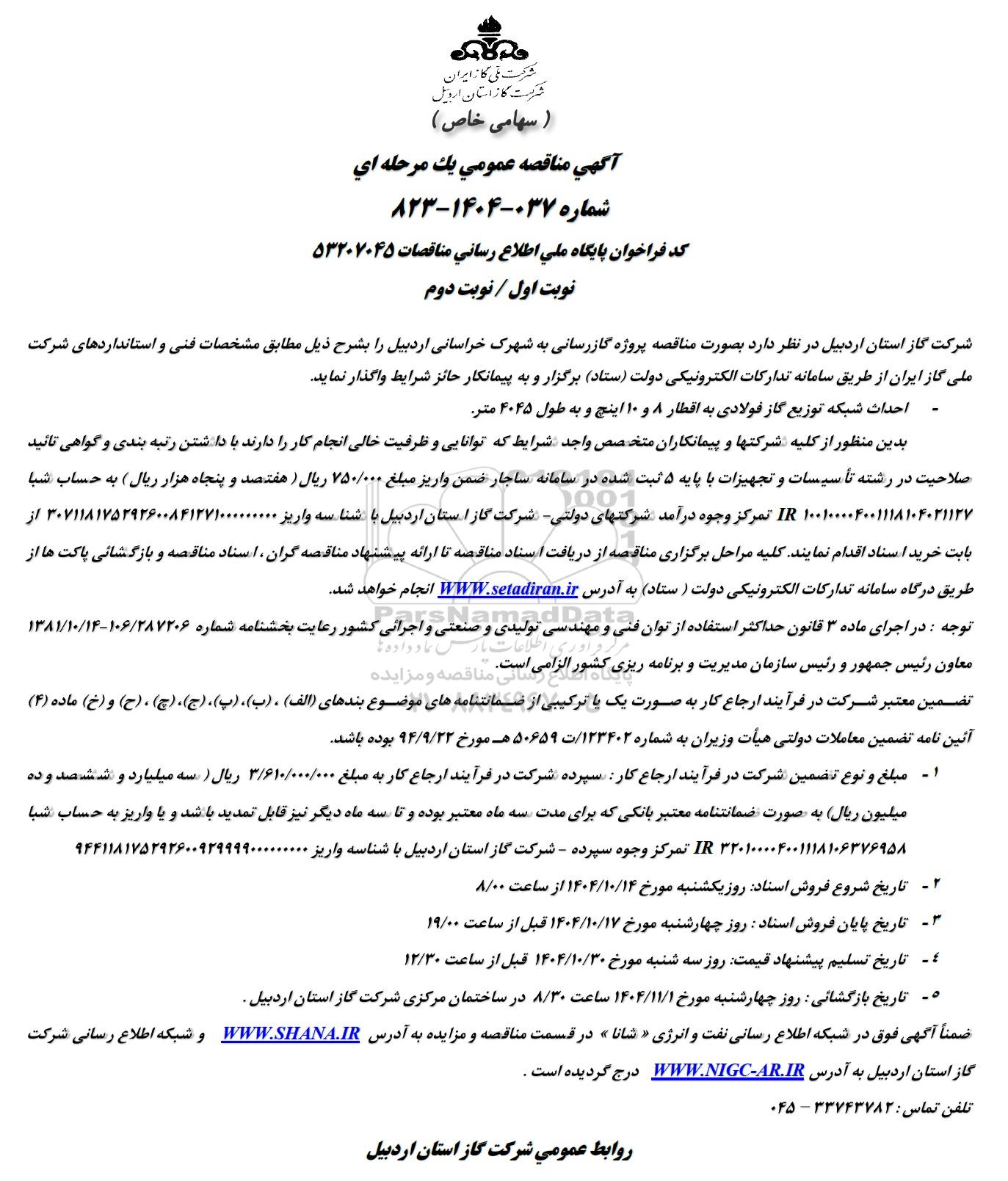 ضمناً آگهی فوق در شبکه اطلاع رسانی نفت و انرژی «شانا » در قسمت مناقصه و مزایده به آدرس WWW.SHANA.IR و شبکه اطلاع رسانی شرکت گاز استان اردبیل به آدرس WWW.NIGC-AR.IR درج گردیده است.