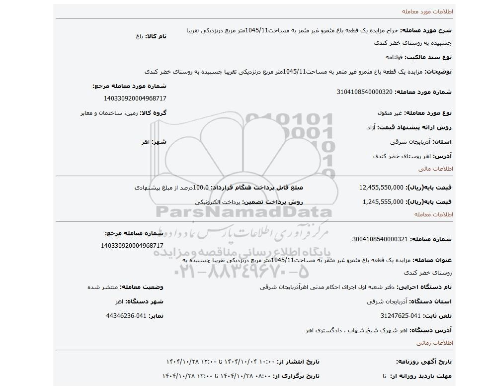 | شرح مورد معامله: حراج مزایده یک قطعه باغ مثمرو غیر مثمر به مساحت1045/11متر مربع درنزدیکی تقریبا چسبیده به روستای خضر کندی | نام کالا: باغ | |