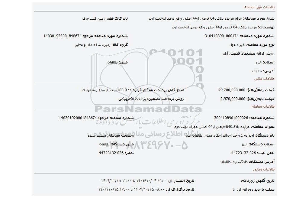 | شماره مورد معامله: 3104108901000174 | شماره مورد معامله مرجع: 140301920001848674 | |