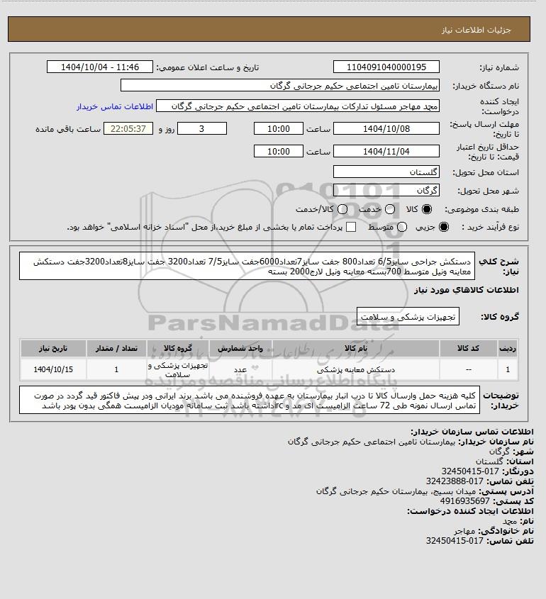 | 1 | -- | دستکش معاینه پزشکی | عدد | تجهیزات پزشکی و سلامت | 1 | 1404/10/15 |