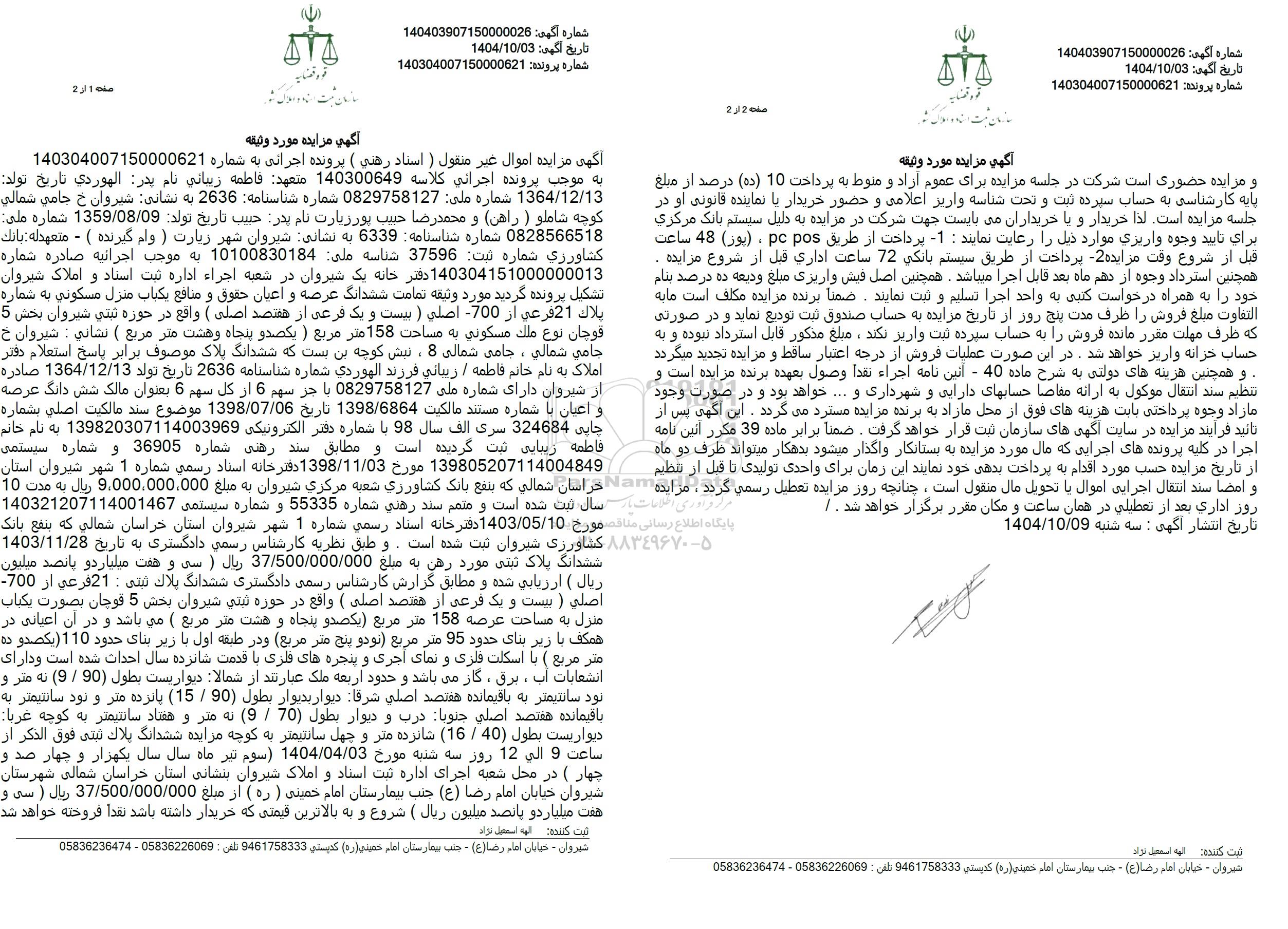 آگهی مزایده اموال غیر منقول ( اسناد رهنی) پرونده اجرائی به شماره 140304007150000621 به موجب پرونده اجرائي كلاسه 140300649 متعهد فاطمه زیبائی نام پدر الهوردي تاريخ تولد: 1364.12.13 شماره ملی: 0829758127 شماره شناسنامه 2636 به نشانی شیروان خ جامي شمالي کوچه شاملو ) (راهن و محمدرضا حبیب پورزیارت نام پدر حبیب تاریخ تولد: 1359.08.09 شماره ملی 0828566518 شماره شناسنامه : 6339 به نشانی شیروان شهر زیارت ( وام گیرنده ) - متعهدله : بانک کشاورزی شماره ثبت 37596 شناسه ملی: 10100830184 به موجب اجرائیه صادره شماره 140304151000000013 دفتر خانه یک شیروان در شعبه اجراء اداره ثبت اسناد و املاک شیروان تشکیل پرونده گردید مورد وثیقه تمامت ششدانگ عرصه و اعیان حقوق و منافع يكباب منزل مسکونی به شماره پلاک 21 فرعی از 700 اصلی ( بیست و یک فرعی از هفتصد اصلی ) واقع در حوزه ثبتی شيروان بخش 5 قوچان نوع ملک مسكونی به مساحت 158 متر مربع ( یکصدو پنجاه و هشت متر مربع) نشانی : شيروان خ جامی شمالی ، جامی شمالی 8 ، نبش کوچه بن بست که ششدانگ پلاک موصوف برابر پاسخ استعلام دفتر املاک به نام خانم فاطمه . زيبائي فرزند الهوردي شماره شناسنامه 2636 تاریخ تولد 1364.12.13 صادره از شیروان دارای شماره ملی 0829758127 با جز سهم 6 از کل سهم 6 بعنوان مالک شش دانگ عرصه و اعیان با شماره مستند مالکیت 1398.6864 تاريخ 1398.07.06 موضوع سند مالكيت اصلي بشماره چاپی 324684 سری الف سال 98 با شماره دفتر الکترونیکی 139820307114003969 به نام خانم فاطمه زیبایی ثبت گردیده است و مطابق سند رهنی شماره 36905 و شماره سیستمی 139805207114004849 مورخ 1398.11.03 دفترخانه اسناد رسمی شماره 1 شهر شیروان استان خراسان شمالی که بنفع بانک کشاورزی شعبه مرکزی شیروان به مبلغ 9،000،000،000 ریال به مدت 10 سال ثبت شده است و متمم سند رهني شماره 55335 و شماره سیستمی 140321207114001467 مورخ 1403.05.10 دفترخانه اسناد رسمی شماره 1 شهر شیروان استان خراسان شمالی که بنفع بانک کشاورزی شیروان ثبت شده است. و طبق نظریه کارشناس رسمی دادگستری به تاریخ 1403.11.28 ششدانگ پلاک ثبتی مورد رهن به مبلغ 37.500.000.000 ريال ( سی و هفت میلیارد و پانصد میلیون ریال ) ارزیابی شده و مطابق گزارش کارشناس رسمی دادگستری ششدانگ پلاک ثبتی : 21 فرعي از 700 اصلي ( بیست و یک فرعی از هفتصد اصلی ( واقع در حوزه ثبتی شیروان بخش 5 قوچان بصورت یکباب منزل به مساحت عرصه 158 متر مربع (يک صد و پنجاه و هشت متر مربع ( ميباشد و در آن اعیانی در همکف با زیر بنای حدود 95 متر مربع نودو پنج متر مربع و در طبقه اول با زیر بنای حدود 110 یکصدو ده متر مربع ( با اسکلت فلزی و نمای آجری و پنجره های فلزی با قدمت شانزده سال احداث شده است و دارای انشعابات آب ، برق ، گاز میباشد و حدود اربعه ملک عبارتند از شمالا دیواریست بطول (90 . 9) نه متر و نود سانتیمتر به باقیمانده هفتصد اصلي شرقا ديوار بديوار بطول 90 . 15 پانزده متر و نود سانتیمتر به باقیمانده هفتصد اصلي جنوبا درب و دیوار بطول (70) . (9) نه متر و هفتاد سانتیمتر به کوچه غربا دیواریست بطول (40) . (16 شانزده متر و چهل سانتیمتر به کوچه مزایده ششدانگ پلاک ثبتی فوق الذکر از ساعت 9 الی 12 روز سه شنبه مورخ 1404.04.03 سوم تیر ماه سال سال یکهزار و چهار صد و چهار ( در محل شعبه اجرای اداره ثبت اسناد و املاک شیروان بنشانی استان خراسان شمالی شهرستان شیروان خیابان امام رضا (ع) جنب بیمارستان امام خمینی ( ره ) از مبلغ 37.500.000.000 ریال ( سی و هفت میلیارد و پانصد میلیون ریال ( شروع و به بالاترین قیمتی که خریدار داشته باشد نقدا فروخته خواهد شد و مزایده حضوری است شرکت در جلسه مزایده برای عموم آزاد و منوط به پرداخت 10 (ده) درصد از مبلغ پایه کارشناسی به حساب سپرده ثبت و تحت شناسه واریز اعلامی و حضور خریدار یا نماینده قانونی او در جلسه مزایده است. لذا خریدار و یا خریداران می بایست جهت شرکت در مزایده به دلیل سیستم بانک مرکزي براي تاييد وجوه واريزي موارد ذیل را رعایت نمایند : -1 پرداخت از طریق pc pos ، (پوز) 48 ساعت قبل از شروع وقت مزایده -2 پرداخت از طريق سيستم بانكي 72 ساعت اداري قبل از شروع مزایده همچنین استرداد 