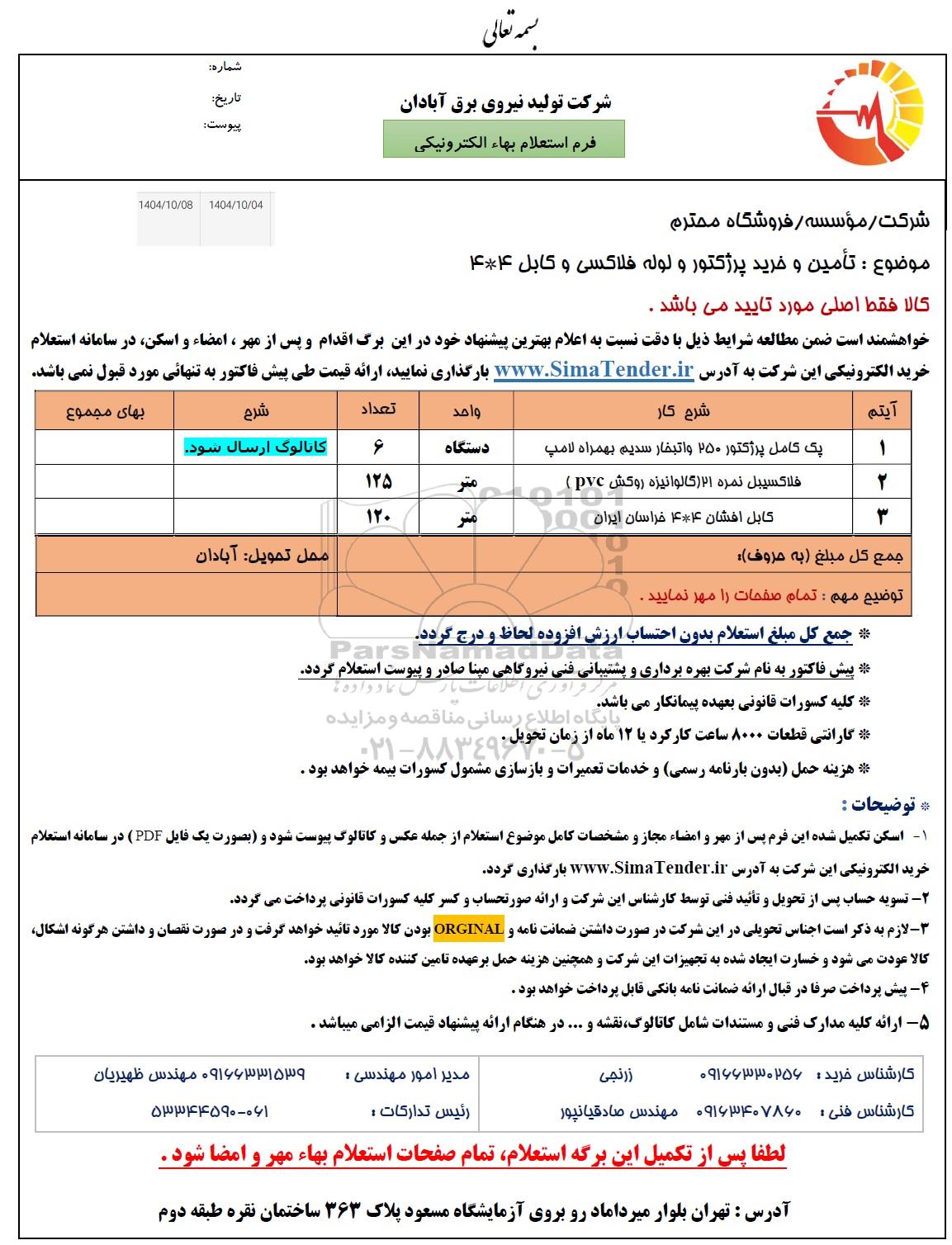 خواهشمند است ضمن مطالعه شرایط ذیل با دقت نسبت به اعلام بهترین پیشنهاد خود در این برگ اقدام و پس از مهر ، امضاء و اسکن در سامانه استعلام خرید الکترونیکی این شرکت به آدرس www.SimaTender.ir بارگذاری نمایید ارائه قیمت طی پیش فاکتور به تنهایی مورد قبول نمی باشد.