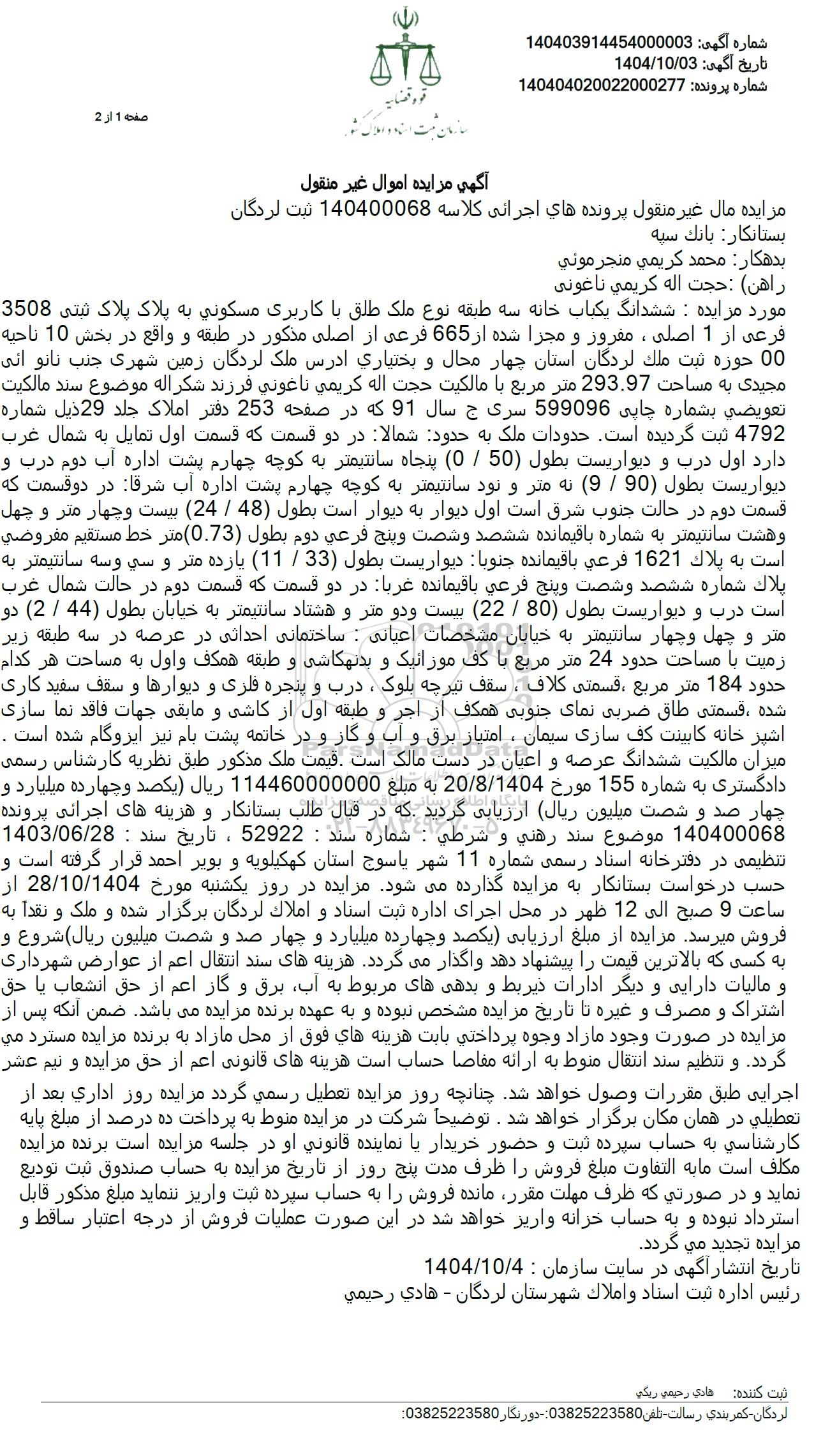 مزایده مال غیر منقول پرونده های اجرائی کلاسه 140400068 ثبت لردگان