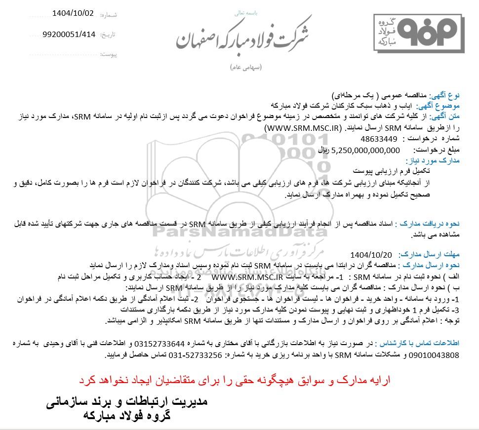 موضوع آگهی: ایاب و ذهاب سبک کارکنان شرکت فولاد مبارکه