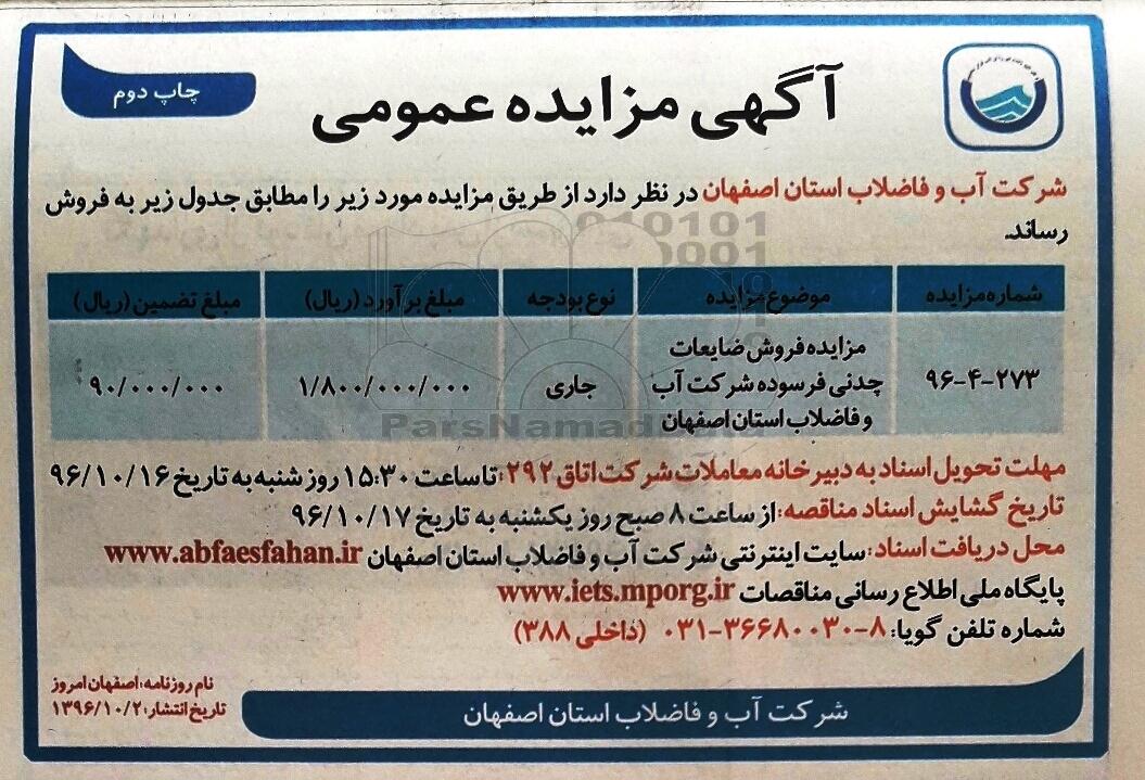 شرکت آب و فاضلاب استان اصفهان در نظر دارد از طریق مزایده مورد زیر را مطابق جدول ذیل به فروش رساند