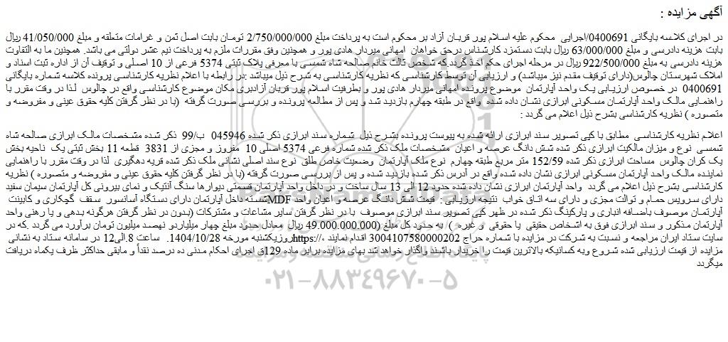 اعلام نظریه کارشناسی مطابق با کپی تصویر سند ابرازی ارائه شده به پیوست پرونده بشرح ذیل شماره سند ابرازی ذکر شده 045946 ب/99 ذکر شده مشخصات مالک ابرازی صالحه شاه شمسی نوع و میزان مالکیت ابرازی ذکر شده شش دانگ عرصه و اعیان مشخصات ملک ذکر شده شماره فرعی 5374 اصلی 10 مفروز و مجزی از 3831 قطعه 11 بخش ثبتی یک ناحیه بخش یک کران چالوس مساحت ابرازی ذکر شده 152/59 متر مربع طبقه چهارم نوع ملک آپارتمان وضعیت خاص طلق نوع سند اصلی نشانی ملک ذکر شده قریه دهگیری لذا در وقت مقرر با راهنمایی نماینده مالک واحد آپارتمان مسکونی ابرازی نشان داده شده واقع در آدرس ذکر شده بازدید شده و پس از بررسی صورت گرفته (با در نظر گرفتن کلیه حقوق عینی و مفروضه و متصوره ) نظریه کارشناسی بشرح ذیل اعلام می گردد واحد آپارتمان ابرازی نشان داده شده حدود 12 الی 13 سال ساخت و در داخل واحد آپارتمان قسمتی دیوارها سنگ آنتیک و نمای بیرونی کل آپارتمان سیمان سفید شسته داخل آپارتمان دارای دستگاه آسانسور سقف گچکاری و کابینت mdf دارای سرویس حمام و توالت مجزی و دارای سه اتاق خواب نتیجه ارزیابی : قیمت شش دانگ عرصه و اعیان واحد آپارتمان موصوف باضافه انباری و پارکینگ ذکر شده در ظهر کپی تصویر سند ابرازی موصوف با در نظر گرفتن سایر مشاعات و مشترکات (بدون در نظر گرفتن هرگونه بدهی و یا رهنی واحد آپارتمان مذکور و سند ابرازی فوق به اشخاص حقیقی یا حقوقی و غیره ) به حدود کل مبلغ (49.000.000.000 ریال معادل حدود مبلغ چهار میلیاردو نهصد میلیون تومان برآورد می گردد .که در روزیکشنبه مورخه 1404/10/28. ساعت 8.الی12 در سامانه ستاد به نشانی سایت ستاد ایران مراجعه و نسبت به شرکت در مزایده با شماره حراج 3004107580000202 اقدام نمایند ، مزایده از قیمت ارزیابی شده شروع وبه کسانیکه بالاترین قیمت را خریدار باشند واگذار خواهد شد بهای مزایده برابر ماده 129ق اجرای احکام مدنی ده درصد نقداً و مابقی حداکثر ظرف یکماه دریافت میگردد