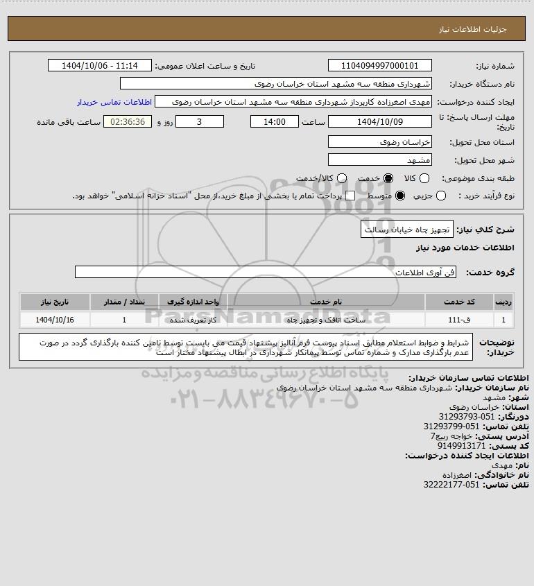 استعلام تجهیز چاه خیابان رسالت, استعلام تجهیز چاه خیابان رسالت