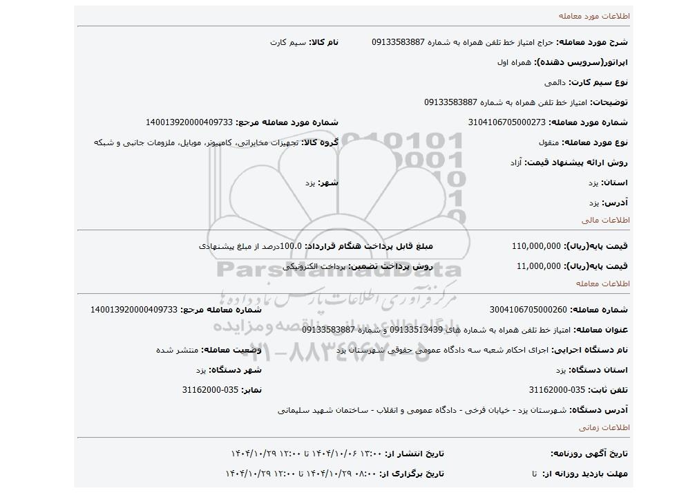 مزایده، امتیاز خط تلفن همراه  به شماره 09133583887
