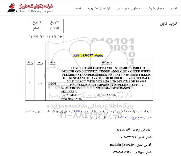 استعلام بها و موضوع استعلام استعلام FLEXIBLE CABLE, 450/750 VOLTS GRADE, .... به اطلاع کلیه شرکتها و افراد متخصص واجد شرایط میرساند، آگهی گذار در نظر دارد از طریق استعلام بها، نسبت به انتخاب و دریافت پیشنهادات اقدام نماید. این استعلام با کد آگهی ثبت شده در سامانه خبرگزاری پارس نماد : 10057837 منتشر شده است. مشخصات استعلام : تاریخ شروع استعلام: 1404/10/06 آخرین مهلت ارسال پیشنهاد قیمت : 1404/10/13 و محل اجرای پروژه : استان مناقصات استان فارس میباشد. استعلام قیمت مورد درخواست : استعلام FLEXIBLE CABLE, 450/750 VOLTS GRADE, .... با دستهبندیهای تخصصی و گروه های مرتبط : سیم و کابل, تجهیزات برق و الکترونیک, استعلام اطلاع رسانی میگردد.