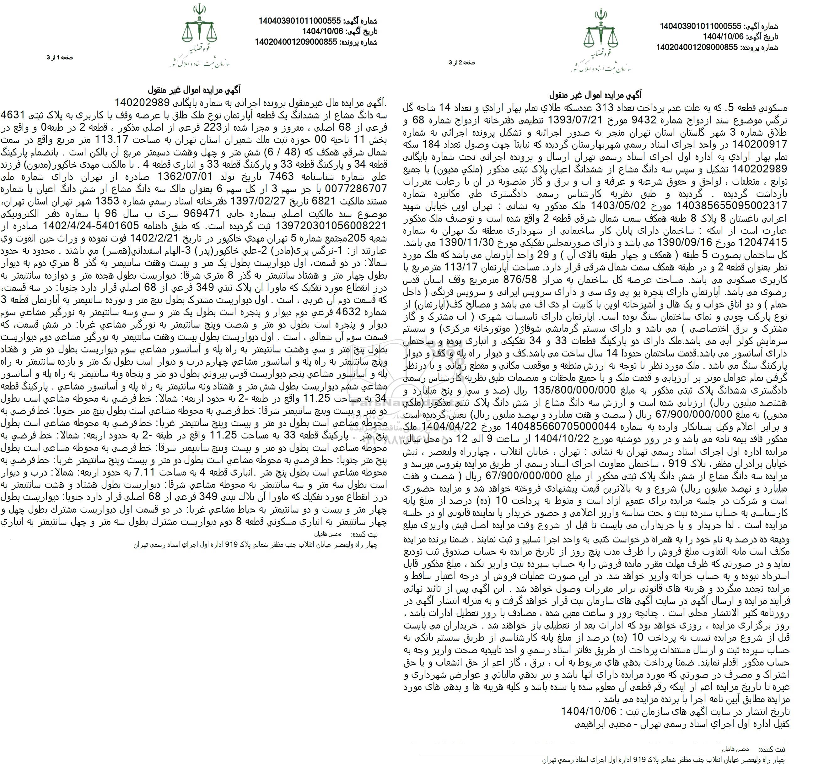 سه دانگ مشاع از ششدانگ یک قطعه آپارتمان نوع ملک طلق با عرصه وقف با کاربری به پلاک ثبتی 4631 فرعی از 68 اصلی، مفروز و مجزا شده از 223 فرعی از اصلی مذکور، قطعه 2 در طبقه 0 و واقع در بخش 11 ناحیه 00 حوزه ثبت ملک شمیران استان تهران به مساحت 113.17 متر مربع واقع در سمت شمال شرقی همکف که (48 . 6) شش متر و چهل و هشت دسیمتر مربع آن بالکن است. بانضمام پارکینگ قطعه 34 و پارکینگ قطعه 33 و پارکینگ قطعه 33 و انباری قطعه 4 . با مالکیت مهدی خاکپور (مدیون) فرزند علی شماره شناسنامه 7463 تاریخ تولد 1362.07.01 صادره از تهران دارای شماره ملی 0077286707 با جز سهم 3 از کل سهم 6 بعنوان مالک سه دانگ مشاع از شش دانگ اعیان با شماره مستند مالکیت 6821 تاریخ 1397.02.27 دفترخانه اسناد رسمی شماره 1353 شهر تهران استان تهران موضوع سند مالکیت اصلی بشماره چاپی 969471 سری به سال 96 با شماره دفتر الکترونیکی 139720301056008221 ثبت گردیده است. که طبق دادنامه 5401605-1402.4.24 صادره از شعبه 205 مجتمع شماره 5 تهران مهدی خاکپور در تاریخ 1402.2.21 فوت نموده و وراث حین الفوت وی عبارتند از: 1- نرگس پری (مادر) -2 علی حاکیور (بدر) -3- الهام اسفیدانی (همسر) می باشند . محدود به حدود شمالا در دو قسمت اول دیواریست بطول یک متر و بیست و هفت سانتیمتر به گذر 8 متری دوم به دیوار بطول چهار متر و هشتاد سانتیمتر به گذر 8 متری شرقا دیواریست بطول هجده متر و دوازده سانتیمتر به درز انقطاع مورد تفکیک که ماورا آن پلاک ثبتی 349 فرعی از 68 اصلی قرار دارد جنوبا در سه قسمت. که قسمت دوم آن غربی است. اول دیواریست مشترک بطول پنج متر و نوزده سانتیمتر به آپارتمان قطعه 3 شماره 4632 فرعی دوم دیوار و پنجره است بطول یک متر و سی و سه سانتیمتر به نورگیر مشاعی سوم دیوار و پنجره است بطول دو متر و شصت و پنج سانتیمتر به نورگیر مشاعی غربا در شش قسمت که قسمت سوم آن شمالی است. اول دیواریست بطول بیست و هفت سانتیمتر به نورگیر مشاعی دوم دیواریست بطول پنج متر و سی و هشت سانتیمتر به راه پله و آسانسور مشاعی سوم دیواریست بطول دو متر و هفتاد و پنج سانتیمتر به راه پله و آسانسور مشاعی چهارم درب و دیوار است بطول یک متر و یازده سانتیمتر به راه پله و آسانسور مشاعی پنجم دیواریست قوس بیرونی بطول دو متر و پنجاه و نه سانتیمتر به راه پله و آسانسور مشاعی ششم دیواریست بطول شش متر و هشتاد و نه سانتیمتر به راه پله و آسانسور مشاعی ، پارکینگ قطعه 34 به مساحت 11.25 واقع در طبقه 2- به حدود اربعه شمالا خط فرضی به محوطه مشاعی است بطول دو متر و بیست وپنج سانتیمتر شرقا خط فرضی به محوطه مشاعی است بطول پنج متر جنوبا خط فرضی به محوطه مشاعی است بطول دو متر و بیست و پنج سانتیمتر غربا خط فرضی به محوطه مشاعی است بطول پنج متر پارکینگ قطعه 33 به مساحت 11.25 واقع در طبقه 2- به حدود اربعه شمالا خط فرضی به محوطه مشاعی است بطول دو متر و بیست وپنج سانتیمتر شرقا خط فرضی به محوطه مشاعی است بطول پنج متر جنوبا خط فرضی به محوطه مشاعی است بطول دو متر و بیست و پنج سانتیمتر غربا خط فرضی به محوطه مشاعی است بطول پنج متر انباری قطعه 4 به مساحت 7.11 به حدود اربعه شمالا درب و دیوار است بطول سه متر و سه سانتیمتر به محوطه مشاعی شرقا دیواریست بطول هشتاد و هشت سانتیمتر به درز انقطاع مورد تفکیک که ماورا أن یلاک ثبتی 349 فرعی از 68 اصلی قرار دارد جنوبا دیواریست بطول چهار متر و بیست و دو سانتیمتر به حیاط مشاعی غربا در دو قسمت اول دیواریست مشترک بطول چهل و چهار سانتیمتر به انباری مسکونی قطعه 8 دوم دیواریست مشترک بطول سه متر و چهل سانتیمتر به انباری مسکونی قطعه 5 که به علت عدم پرداخت تعداد 313 عدد سکه طلای تمام بهار آزادی و تعداد 14 شاخه گل نرگس موضوع سند ازدواج شماره 9432 مورخ 1393.07.21 تنظیمی دفترخانه ازدواج شماره 68 و طلاق شماره 3 شهر گلستان استان تهران منجر به صدور اجرائیه و تشکیل پرونده اجرائی به شماره 140200917 در واحد اجرای اسناد رسمی شهر بهارستان گردیده که نیابتا جهت وصول تعداد 184 سکه تمام بهار آزادی به اداره اول اجرای اسناد رسمی تهران ارسال و پرونده اجر