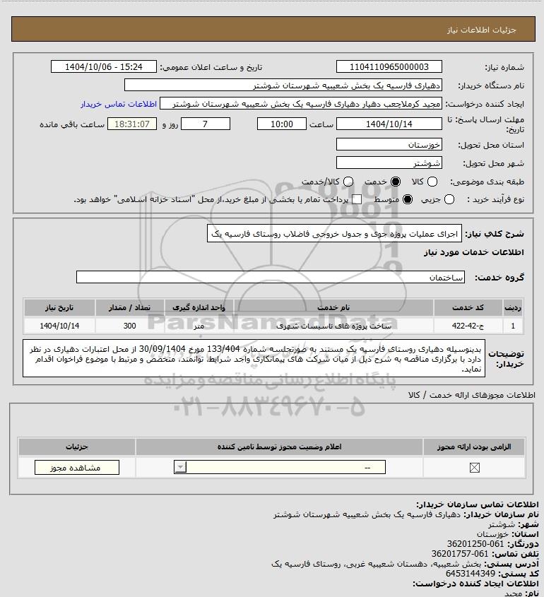 توضیحات خریدار:بدینوسیله دهیاری روستای فارسیه یک مستند به صورتجلسه شماره 133/404 مورخ 30/09/1404 از محل اعتبارات دهیاری در نظر دارد با برگزاری مناقصه به شرح ذیل از میان شرکت های پیمانکاری واجد شرایط، توانمند، متخصص و مرتبط با موضوع فراخوان اقدام نماید.