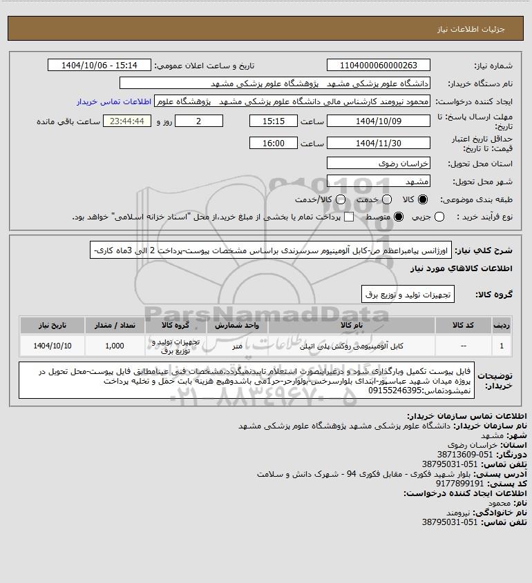 1 -- کابل آلومینیومی روکش پلی اتیلن متر تجهیزات تولید و توزیع برق 1,000 1404/10/10