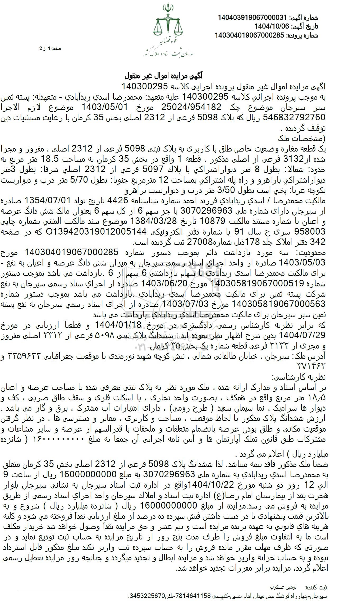 ضمنا ملک مذکور فاقد بیمه میباشد. لذا ششدانگ پلاک 5098 فرعی از 2312 اصلی بخش 35 کرمان متعلق به محمدرضا اسدی زیدآبادی به شماره ملی 3070296963 به مبلغ 16000000000 ریال از ساعت 9 الی 12 روز دو شنبه مورخ 1404.10.22 واقع در اداره ثبت اسناد سیرجان به نشانی سیرجان بلوار هجرت بعد از بیمارستان امام رضا (ع) اداره ثبت اسناد و املاک سیرجان واحد اجرای اسناد رسمی از طریق مزایده به فروش می رسد. مزایده از مبلغ 16000000000 ریال ( شانزده میلیارد ریال ) شروع و به بالاترین قیمت پیشنهادی با در دست داشتن فیش سپرده ده درصد از مبلغ ارزیابی نقدا فروخته می شود و د كلیه هزینه های قانونی به عهده برنده مزایده است و نیم عشر و حق مزایده نقداً وصول خواهد شد خریدار مکلف است ما به التفاوت مبلغ فروش را ظرف مدت پنج روز از تاریخ مزایده به حساب ثبت تودیع نماید و در صورتی که ظرف مهلت مقرر مانده فروش را به حساب سپرده ثبت واریز نکند مبلغ مذکور قابل استرداد نبوده و به حساب خزانه واریز خواهد شد و مزایده ابطال و تجدید میگردد و چنانچه روز مزایده تعطیل رسمی. اعلام گردد مزایده برابر مقررات تجدید خواهد شد.