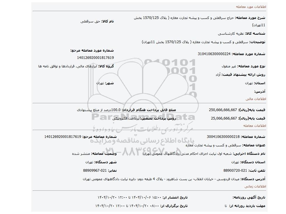 مزایده،  سرقفلی و کسب و پیشه تجارت مغازه ( پلاک 1570/125 بخش 11تهران)