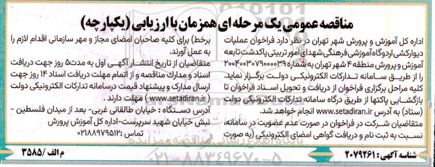 اداره کل آموزش و پرورش شهر تهران در نظر دارد فراخوان عملیات دیوارکشی اردوگاه آموزشی فرهنگی شهدای امور تربیتی پاکدشت تابعه آموزش و پرورش منطقه 4 شهر تهران به شماره 2004003079000039 را از طریق سامانه تدارکات الکترونیکی دولت برگزار نماید