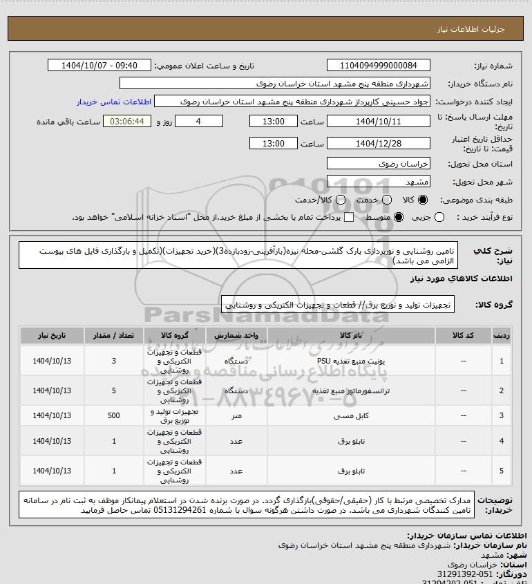 شرح کلی نیاز: تامین روشنایی و نورپردازی پارک گلشن-محله نیزه(بازآفرینی-زودبازده3)(خرید تجهیزات)(تکمیل و بارگذاری فایل های پیوست الزامی می باشد)