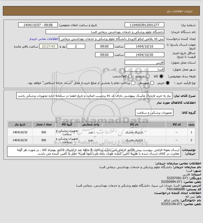 | 1 | -- | لارنژیال ماسک | عدد | تجهیزات پزشکی و سلامت | 500 | 1404/10/10 |