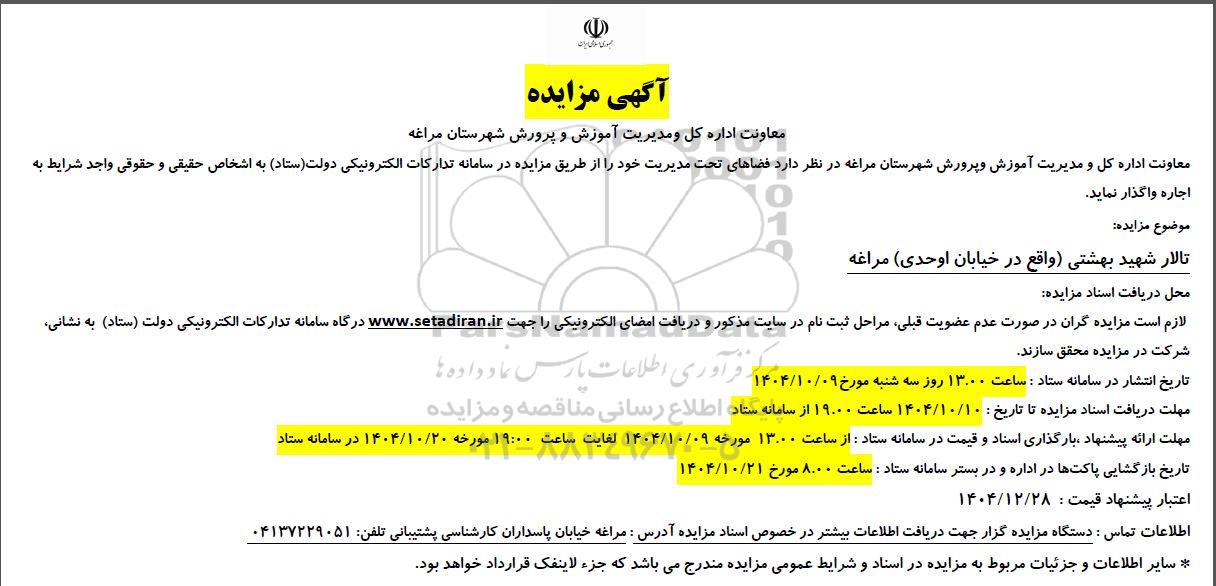 معاونت اداره کل و مدیریت آموزش و پرورش شهرستان مراغه در نظر دارد فضاهای تحت مدیریت خود را از طریق مزایده در سامانه تدارکات الکترونیکی دولت (ستاد) به اشخاص حقیقی و حقوقی واجد شرایط به اجاره واگذار نماید.