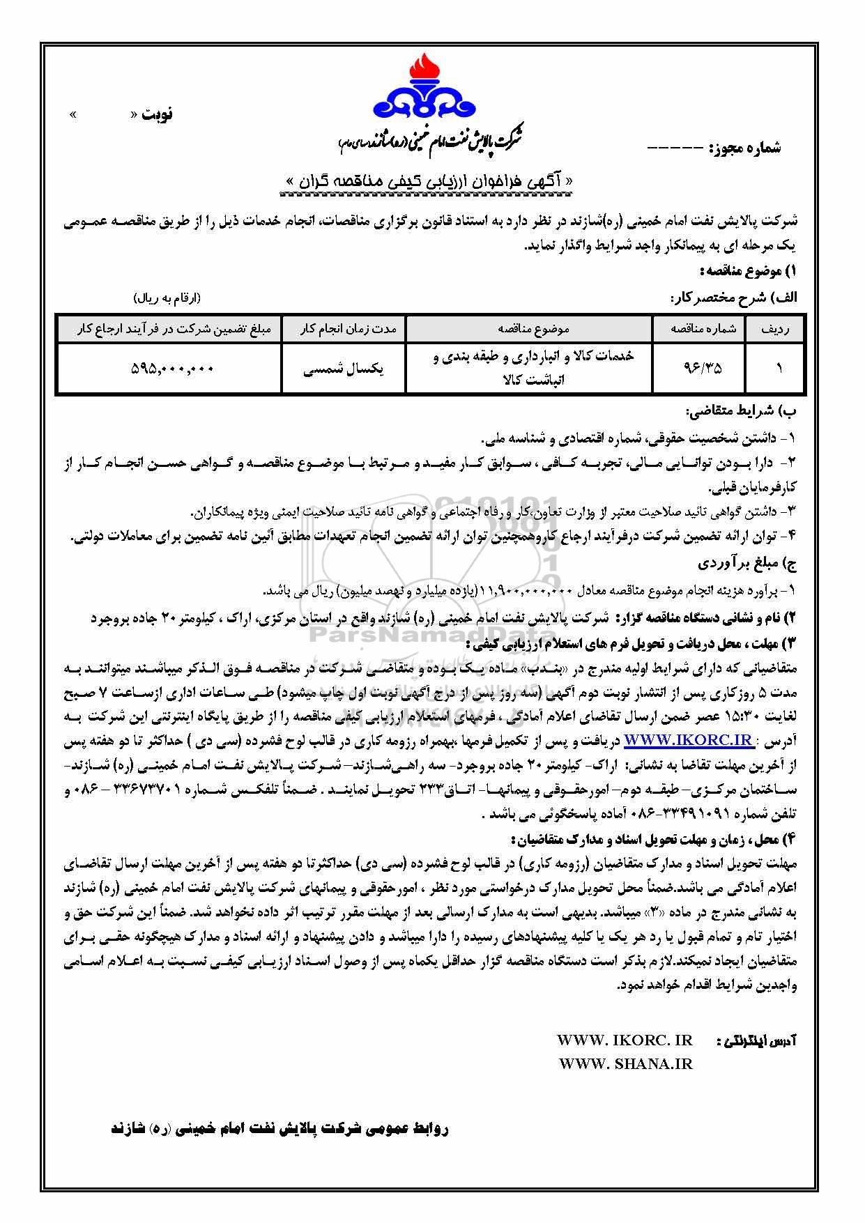 شرکت پالایش نفت امام خمینی (ره) شازند در نظر دارد انجام خدمات ذیل را از طریق مناقصه عمومی یک مرحله ای به پیمانکار واجد شرایط واگذار نماید