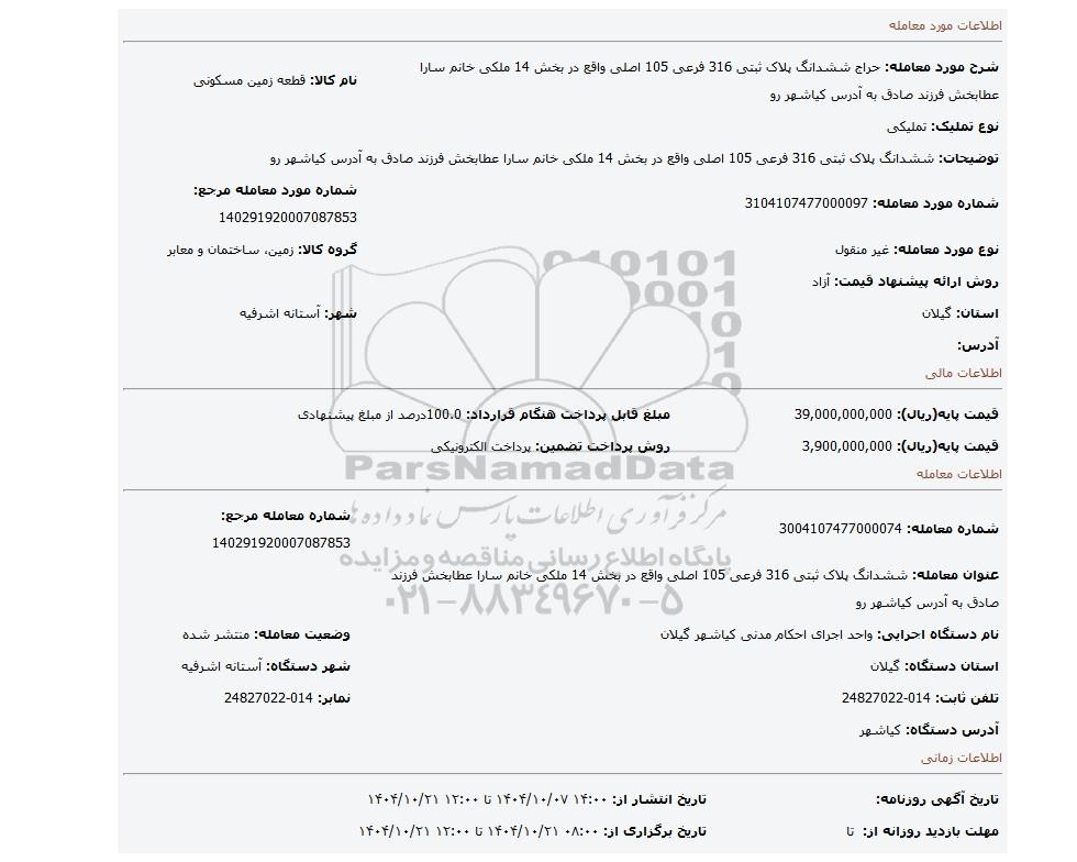 | شرح مورد معامله: حراج ششدانگ پلاک ثبتی 316 فرعی 105 اصلی واقع در بخش 14 ملکی خانم سارا عطابخش فرزند صادق به آدرس کیاشهر رو | نام کالا: قطعه زمین مسکونی | |