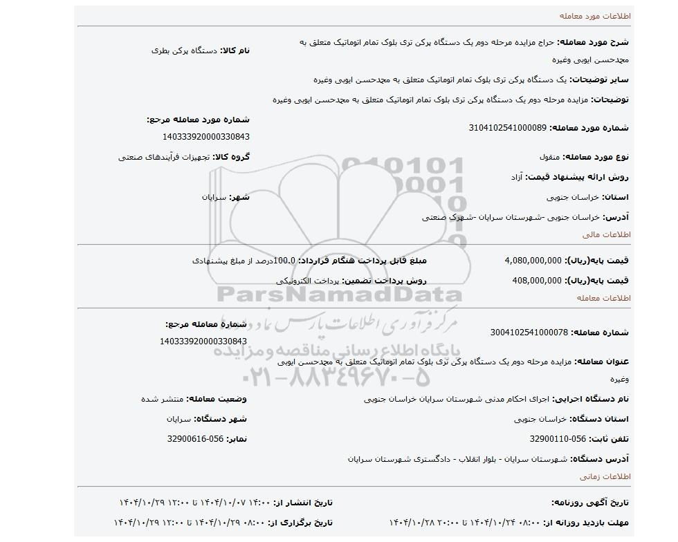 | شماره مورد معامله: 3104102541000089 | شماره مورد معامله مرجع: 140333920000330843 | |