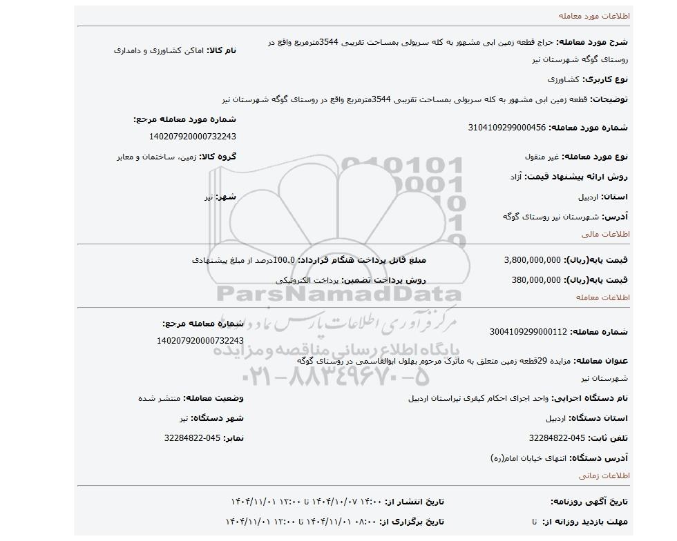 مزایده عمومی مزایده قطعه زمین ابی مشهور به کله سریولی بمساحت تقریبی 3544مترمربع واقع در روستای گوگه شهرستان نیر برگزار میگردد. از کلیه افراد متخصص و شرکت‌های واجد شرایط دعوت به عمل می‌آید تا در این مزایده با کد خبرگزاری پارس نماد : 10064591 شرکت نمایند تاریخ شروع مزایده : 1404/10/07 مهلت شرکت در مزایده: تا پایان روز 1404/11/01 مکان برگزاری اموال واگذاری استان‌های مزایدات استان اردبیل و دسته‌بندی‌های مربوط به این حراجی ماشین آلات و تجهیزات کشاورزی و دام پروری, املاک و زمین میباشد.
