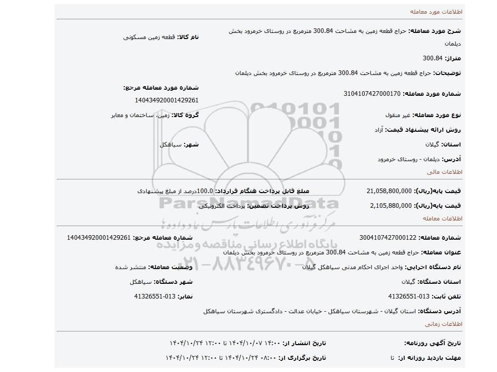 | شرح مورد معامله: حراج قطعه زمین به مشاحت 300.84 مترمربع در روستای خرمرود بخش دیلمان | نام کالا: قطعه زمین مسکونی | |