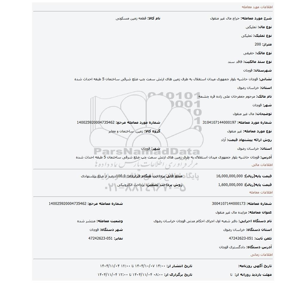 | شماره مورد معامله: 3104107144000197 | شماره مورد معامله مرجع: 140025920004735462 | |