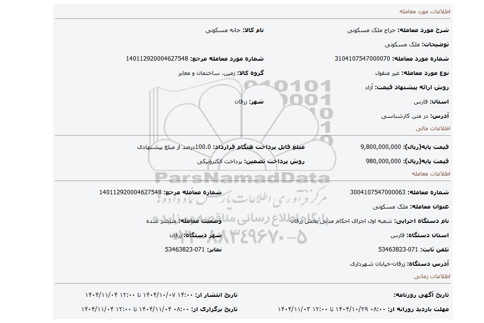 | شماره معامله: 3004107547000063 | شماره معامله مرجع: 140112920004627548 | |