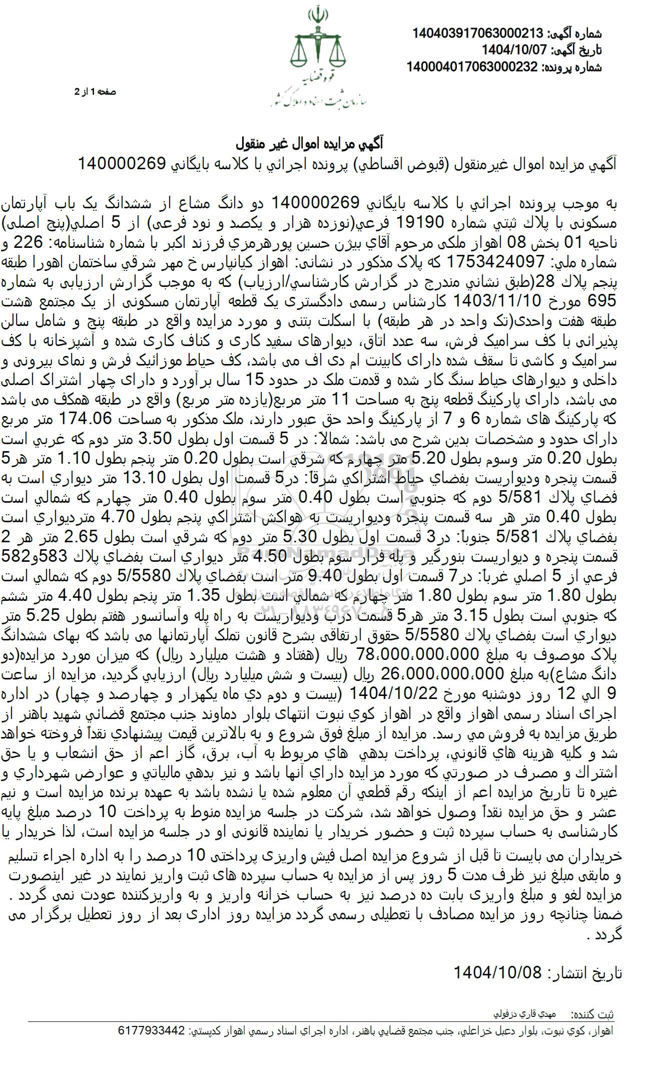 به موجب پرونده اجرائی با کلاسه بایگانی 140000269 دو دانگ مشاع از ششدانگ یک باب آپارتمان مسکونی با پلاک ثبتی شماره 19190 فرعی نوزده هزار و یکصد و نود فرعی از 5 اصلی (پنج اصلی) ناحیه 01 بخش 08 اهواز ملکی مرحوم آقای بیژن حسین پور هرمزی فرزند اکبر با شماره شناسنامه 226 و شماره ملی : 1753424097 که پلاک مذکور در نشانی اهواز کیانپارس خ مهر شرقی ساختمان اهو را طبقه پنجم پلاک 28 طبق نشانی مندرج در گزارش کارشناسی ارزیاب که به موجب گزارش ارزیابی به شماره 695 مورخ 1403.11.10 کارشناس رسمی دادگستری یک قطعه آپارتمان مسکونی از یک مجتمع هشت طبقه هفت واحدی تک واحد در هر طبقه با اسکلت بتنی و مورد مزایده واقع در طبقه پنج و شامل سالن پذیرانی با کف سرامیک ،فرش سه عدد ،اتاق دیوارهای سفید کاری و کناف کاری شده و آشپزخانه با کف سرامیک و کاشی تا سقف شده دارای کابینت ام دی اف می باشد کف حیاط موزائیک فرش و نمای بیرونی و داخلی و دیوارهای حیاط سنگ کار شده و قدمت ملک در حدود 15 سال برآورد و دارای چهار اشتراک اصلی می باشد دارای پارکینگ قطعه پنج به مساحت 11 متر مربع یازده متر مربع واقع در طبقه همکف می باشد. که پارکینگ های شماره 6 و 7 از پارکینگ واحد حق عبور دارند ملک مذکور به مساحت 174.06 متر مربع دارای حدود و مشخصات بدین شرح میباشد شمالا در 5 قسمت اول بطول 3.50 متر دوم که غربی است. بطول 0.20 متر وسوم بطول 5.20 متر چهارم که شرقی است بطول 0.20 متر ینجم بطول 1.10 متر هر 5 قسمت پنجره و دیواریست بفضای حیاط اشتراکی شرقا در 5 قسمت اول بطول 13.10 متر دیواری است به فضای بلاک 5.581 دوم که جنوبی است بطول 0.40 متر سوم بطول 0.40 متر چهارم که شمالی است. بطول 0.40 متر هر سه قسمت پنجره و دیواریست به هواکش اشتراکی ینجم بطول 4.70 متر دیواری است. بقضای بلاک 5.581 جنوبا در 3 قسمت اول بطول 5.30 متر دوم که شرقی است بطول 2.65 متر هر 2 قسمت پنجره و دیواریست بنورگیر و پله فرار سوم یطول 4.50 متر دیواری است بفضای بلاک 583 و 582 فرعی از 5 اصلی غرباً در 7 قسمت اول بطول 9.40 متر است بفضای پلاک 5.5580 دوم که شمالی است. بطول 1.80 متر سوم بطول 1.80 متر چهارم که شمالی است بطول 1.35 متر پنجم بطول 4.40 متر ششم که جنوبی است بطول 3.15 متر هر 5 قسمت درب و دیواریست به راه پله و آسانسور هفتم بطول 5.25 متر دیواری است بفضای پلاک 5.5580 حقوق ارتفاقی بشرح قانون تملک آپارتمانها میباشد که بهای ششدانگ پلاک موصوف به مبلغ 78,000,000,000 ریال هفتاد و هشت میلیارد ریال که میزان مورد مزایده دو دانگ مشاع به مبلغ 26,000,000,000 ریال بیست و شش میلیارد ریال ارزیابی گردید مزایده از ساعت 9 الی 12 روز دوشنبه مورخ 1404.10.22 بیست و دوم دی ماه یکهزار و چهارصد و چهار در اداره اجرای اسناد رسمی اهواز واقع در اهواز کوی نبوت انتهای بلوار دماوند جنب مجتمع قضائی شهید باهنر از طریق مزایده به فروش میرسد. مزایده از مبلغ فوق شروع و به بالاترین قیمت پیشنهادی نقدا فروخته خواهد شد و کلیه هزینه های قانونی پرداخت بدهی های مربوط به آب برق گاز اعم از حق انشعاب و یا حق اشتراک و مصرف در صورتی که مورد مزایده دارای آنها باشد و نیز بدهی مالیاتی و عوارض شهرداری و غیره تا تاریخ مزایده اعم از اینکه رقم قطعی آن معلوم شده یا نشده باشد به عهده برنده مزایده است و نیم عشر و حق مزایده نقداً وصول خواهد شد شرکت در جلسه مزایده منوط به پرداخت 10 درصد مبلغ پایه کارشناسی به حساب سپرده ثبت و حضور خریدار با نماینده قانونی او در جلسه مزایده است لذا خریدار یا خریداران می بایست تا قبل از شروع مزایده اصل فیش واریزی پرداختی 10 درصد را به اداره اجراء تسلیم و مابقی مبلغ نیز ظرف مدت 5 روز پس از مزایده به حساب سپردههای ثبت واریز نمایند در غیر اینصورت مزایده لغو و مبلغ واریزی بابت ده درصد نیز به حساب خزانه واریز و به واریز کننده عودت نمی گردد . ضمنا چنانچه روز مزایده مصادف با تعطیلی رسمی گردد مزایده روز اداری بعد از روز تعطیل برگزار می گردد .