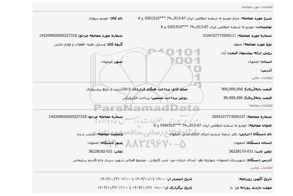 | عنوان معامله: خودرو به شماره انتظامی ایران 67-513ب74 ***0301510 ج 6 | ||