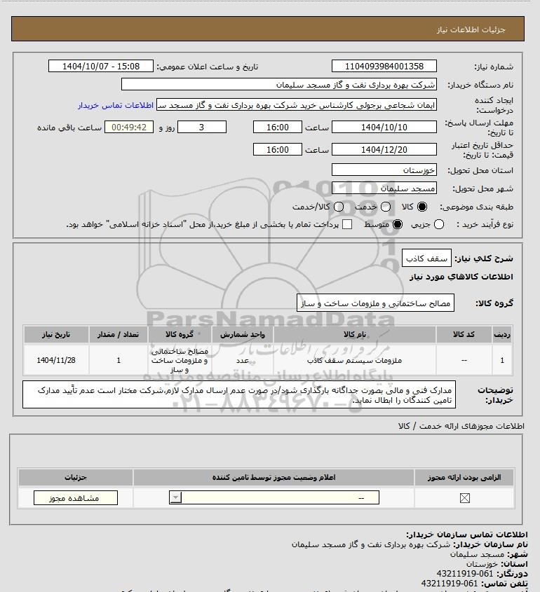 استعلام بها و موضوع استعلام استعلام سقف کاذب به اطلاع کلیه شرکتها و افراد متخصص واجد شرایط میرساند، آگهی گذار در نظر دارد از طریق استعلام بها، نسبت به انتخاب و دریافت پیشنهادات اقدام نماید. این استعلام با کد آگهی ثبت شده در سامانه خبرگزاری پارس نماد : 10064623 منتشر شده است. مشخصات استعلام : تاریخ شروع استعلام: 1404/10/07 آخرین مهلت ارسال پیشنهاد قیمت : 1404/10/10 و محل اجرای پروژه : استان مناقصات استان خوزستان میباشد. استعلام قیمت مورد درخواست : استعلام سقف کاذب با دستهبندیهای تخصصی و گروه های مرتبط : دکوراسیون داخلی, مصالح ساختمانی, استعلام اطلاع رسانی میگردد.