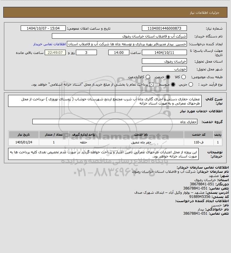 استعلام عملیات حفاری دستی و اجرای گالری چاه آب شرب مجتمع اردنج شهرستان خوشاب ( روستای نوروزی ) -پرداخت از محل طرحهای عمرانی و به صورت اسناد خزانه, استعلام عملیات حفاری دستی و اجرای گالری چاه آب شرب مجتمع اردنج شهرستان خوشاب ( روستای نوروزی ) -پرداخت از محل طرحهای عمرانی و به صورت اسناد خزانه