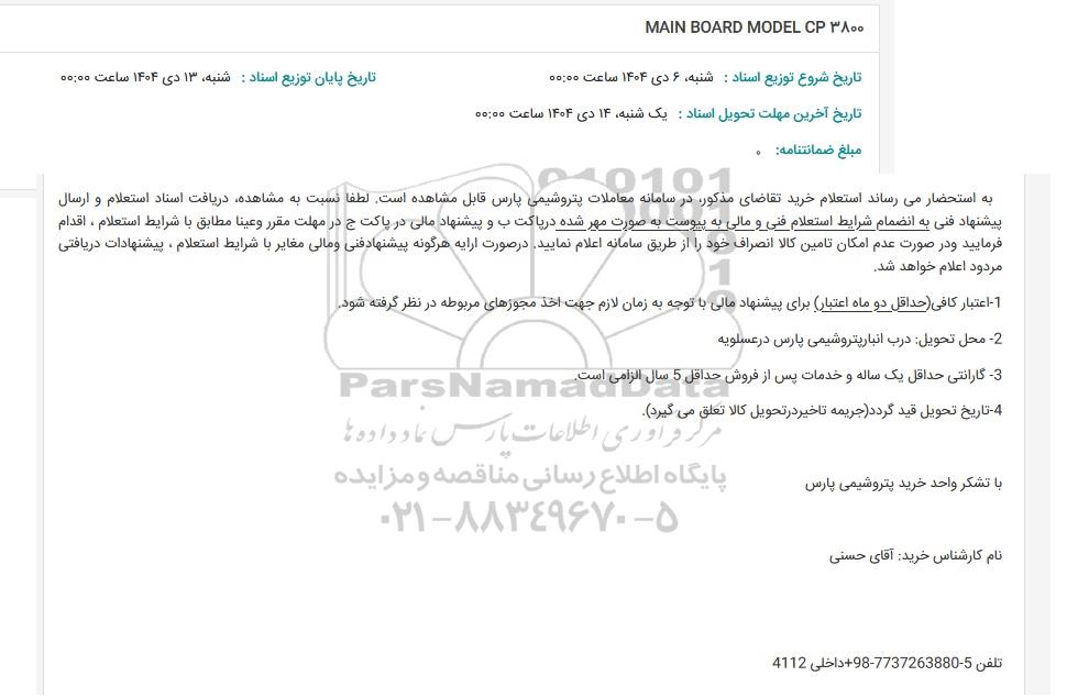 استعلام بها و موضوع استعلام استعلام MAIN BOARD MODEL CP 3800 به اطلاع کلیه شرکتها و افراد متخصص واجد شرایط میرساند، آگهی گذار در نظر دارد از طریق استعلام بها، نسبت به انتخاب و دریافت پیشنهادات اقدام نماید. این استعلام با کد آگهی ثبت شده در سامانه خبرگزاری پارس نماد : 10064673 منتشر شده است. مشخصات استعلام : تاریخ شروع استعلام: 1404/10/07 آخرین مهلت ارسال پیشنهاد قیمت : 1404/10/13 و محل اجرای پروژه : استان مناقصات استان بوشهر میباشد. استعلام قیمت مورد درخواست : استعلام MAIN BOARD MODEL CP 3800 با دستهبندیهای تخصصی و گروه های مرتبط : کامپیوتر, استعلام اطلاع رسانی میگردد.