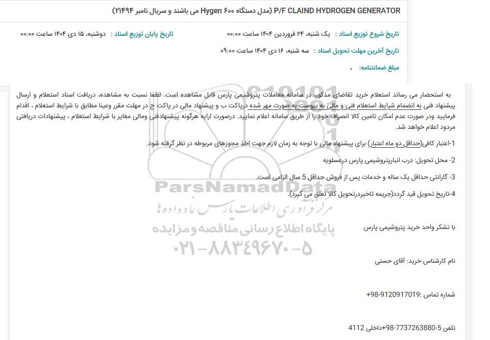 استعلام P/F CLAIND HYDROGEN GENERATOR مدل دستگاه 600 Hygen , استعلام P/F CLAIND HYDROGEN GENERATOR مدل دستگاه 600 Hygen
