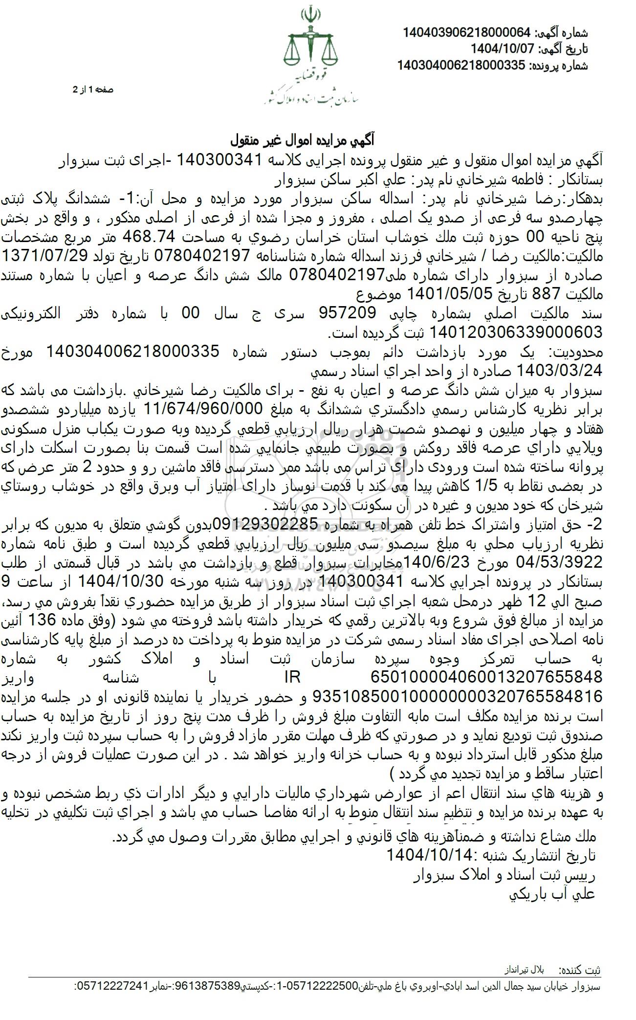 آگهی مزایده اموال منقول و غیر منقول پرونده اجرایی کلاسه 140300341 - اجرای ثبت سبزوار بستانکار : فاطمه شیرخانی نام پدر علی اكبر ساكن سبزوار
