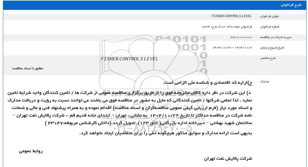 عنوان فراخوان FISHER CONTROLS LEVEL