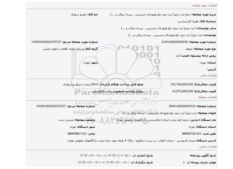 قیمت پایه(ریال): 10,575,600,000روش پرداخت تضمین: پرداخت الکترونیکی