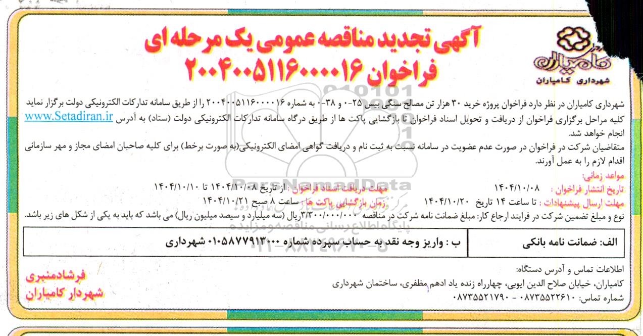 شهرداری کامیاران در نظر دارد فراخوان پروژه خرید 30 هزار تن مصالح سنگی بیس 25- 0 و 38- 0  به شماره 2004005116000016 را از طریق سامانه تدارکات الکترونیکی دولت برگزار نماید.