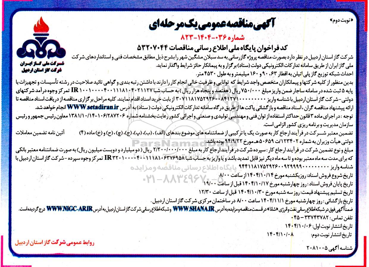 شرکت گاز استان اردبیل در نظر دارد به صورت مناقصه پروژه گازرسانی به سد سبلان مشگین شهر را به شرح ذیل مطابق مشخصات فنی و استانداردهای شرکت ملی گاز ایران از طریق سامانه تدارکات الکترونیکی دولت ستاد برگزار و به پیمانکار حائز شرایط واگذار نماید