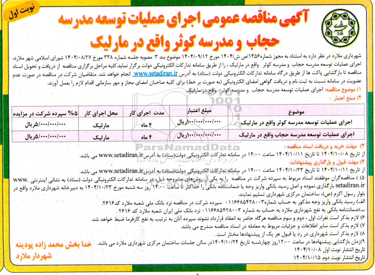 شهرداری ملارد در نظر دارد به استناد به مجوز شماره 1356 ص ش . 1404 مورخ 1404.09.12 موضوع بند 3 مصوبه جلسه شماره 338 مورخ 1404.08.27 شورای اسلامی شهر ملارد اجرای عملیات توسعه مدرسه حجاب و مدرسه کوثر واقع در مارلیک را از طریق سامانه تدارکات الکترونیکی دولت برگزار نماید. کلیه مراحل برگزاری مناقصه از دریافت و تحویل اسناد مناقصه تا بازگشایی پاکتها از طریق درگاه سامانه تدارکات الکترونیکی دولت (ستاد) به آدرس سایت ستاد ایران انجام خواهد شد. متقاضیان شرکت در مناقصه در صورت عدم عضویت در سامانه نسبت به ثبت نام و دریافت گواهی امضای الکترونیکی به صورت بر خط برای کلیه صاحبان امضای مجاز و مهر سازمانی اقدام لازم را بعمل آورند.