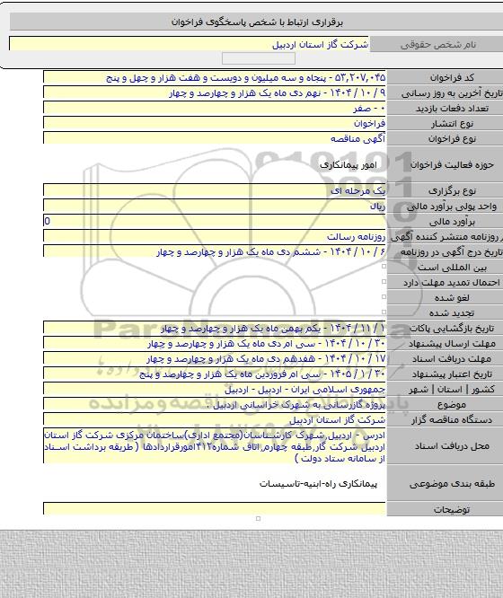 مناقصه پروژه گازرسانی به شهرک خراسانی اردبیل از کلیه افراد متخصص و شرکتها واجد شرایط دعوت به عمل میآید در مناقصه با کد خبرگزاری پارس نماد: 10066889 شرکت نمایند.