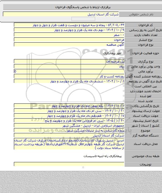 این مناقصه در استان مناقصات استان اردبیل با دسته بندی های صنفی و تخصصی پیمانکاری نفت و گاز و پتروشیمی برگزار میشود.