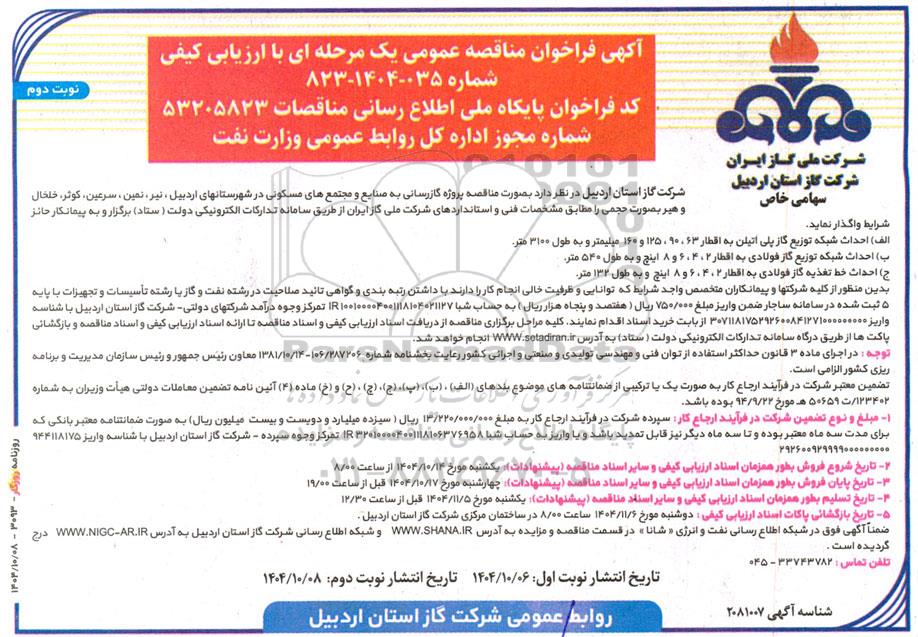 آگهی فراخوان مناقصه عمومی یک مرحله ای با ارزیابی کیفی شماره 035-1404-823