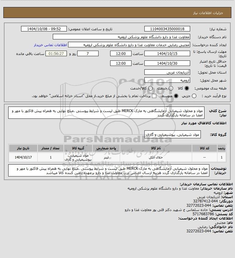 شرح کلی نیاز: مواد و محلول شیمیایی آزمایشگاهی به مارک MERCK طبق لیست و شرایط پیوستی .مبلغ نهایی به همراه پیش فاکتور با مهر و امضا در سامانه بارگذاری گردد