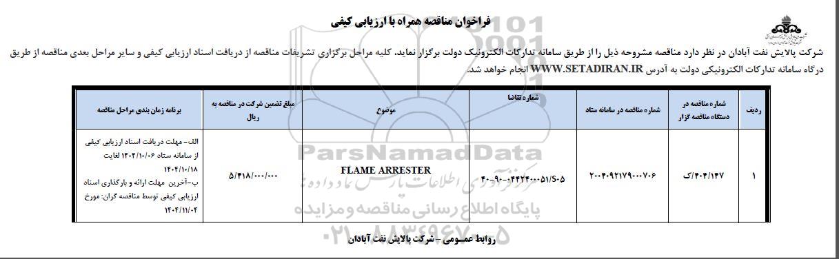 | 1 | 404/147/ک | 2004092179000706 | 40-90-0442400051/S05 | FLAME ARRESTER | 5.418.000.000 |
