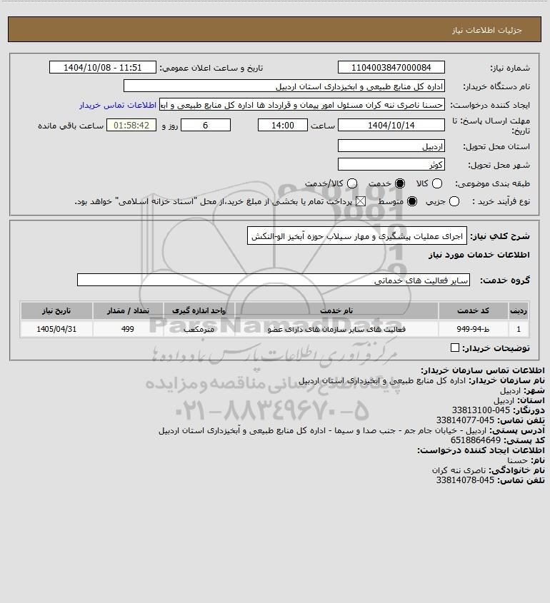 شرح کلی نیاز: اجرای عملیات پیشگیری و مهار سیلاب حوزه آبخیز الو-النکش