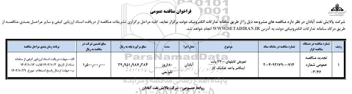 1 تجدید مناقصه عمومی شماره 03/46  2004092179000714 تعویض کابلهای 3300 ولت اینکامر واحد تفکیک گاز  آبادان 180 روز تقویمی  29.951.987.284 1.500.000.000